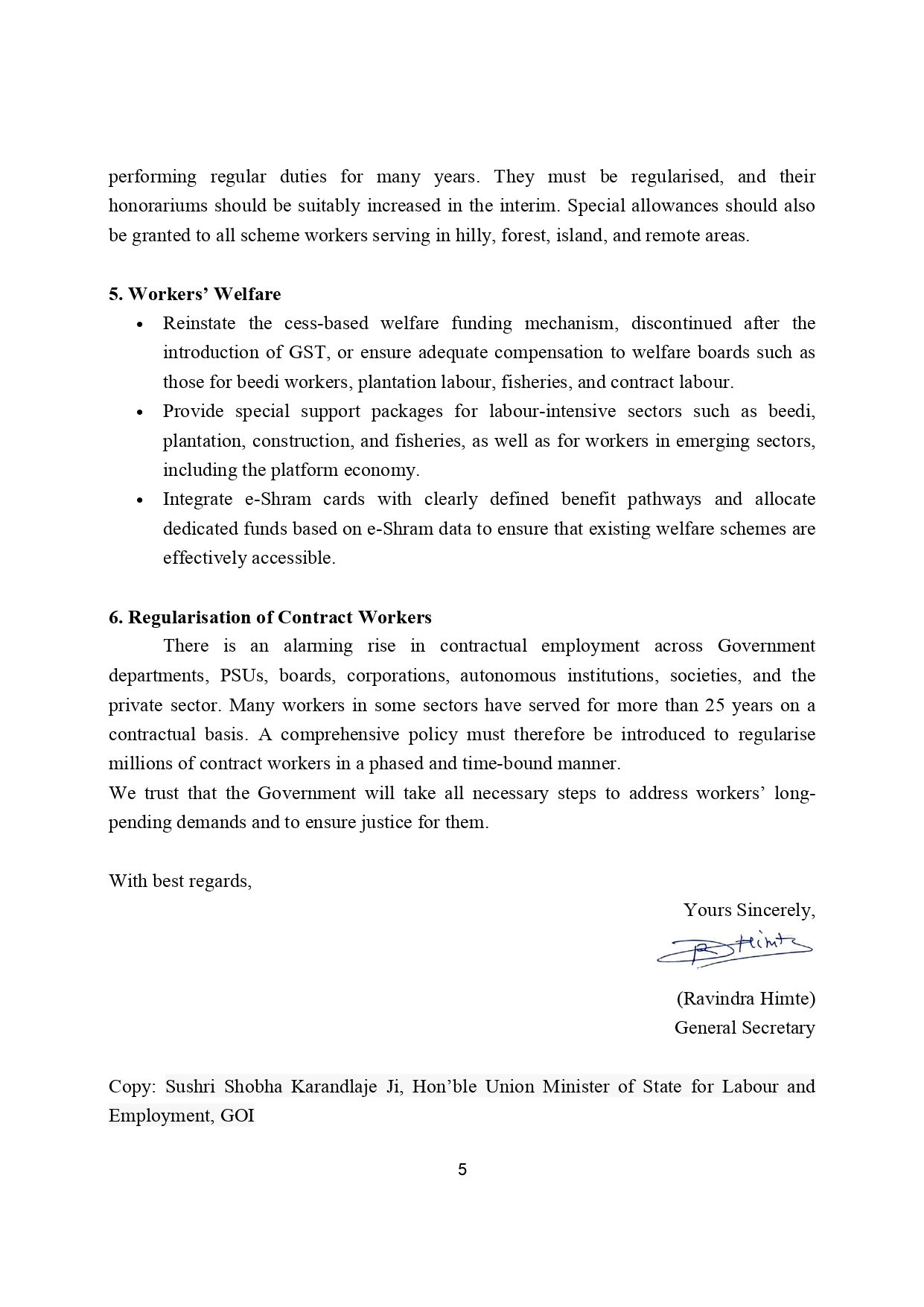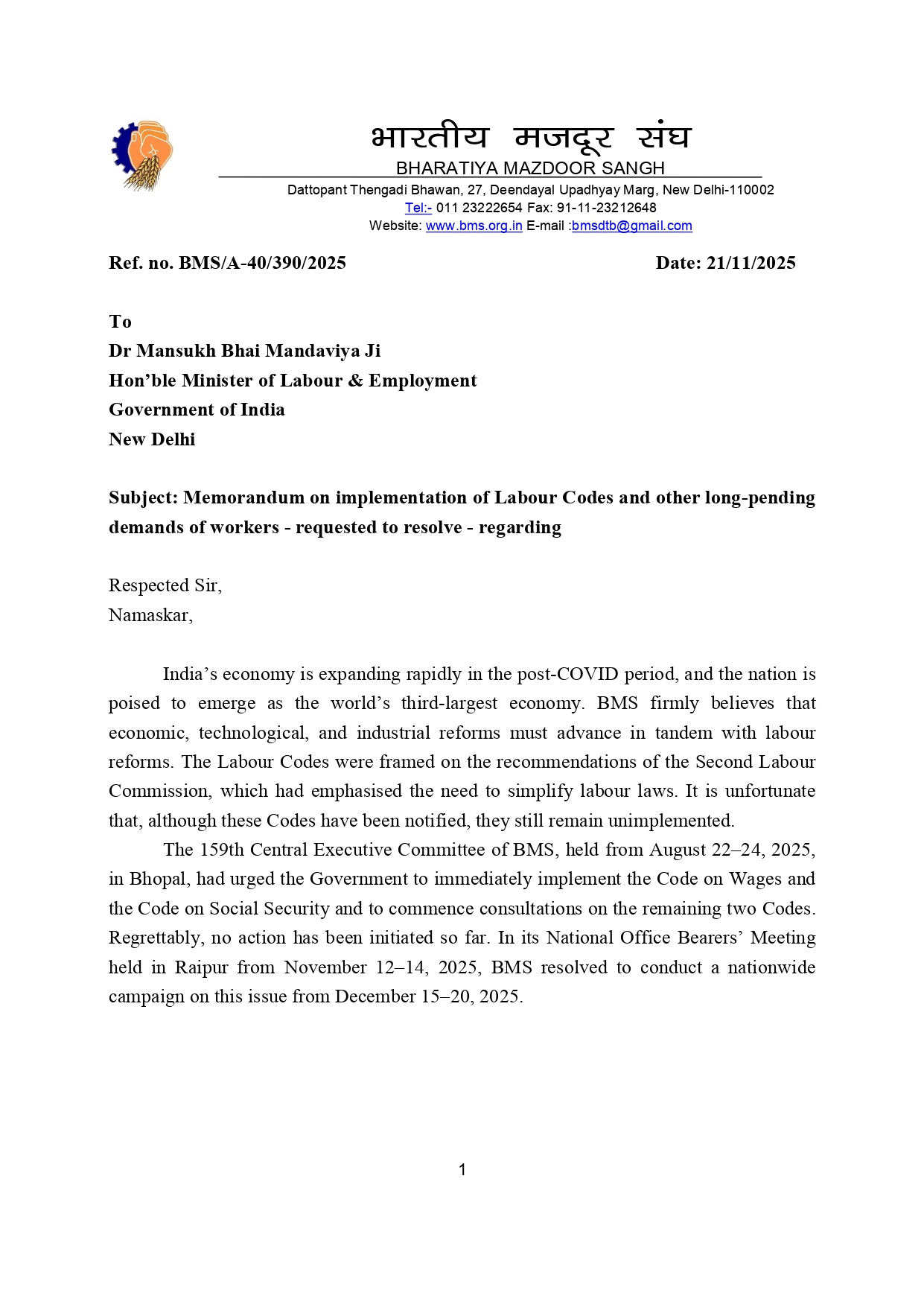 Memorandum on implementation of Labour Codes and other long-pending demands of workers – requested to resolve – regarding Share Facebook Twitter Pinterest Linkedin